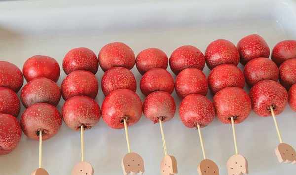 ①选用优质山楂,洗净沥干,用竹签串起来。一根棍子上的弦数取决于棍子的长度。较短的弦为3-4,较长的弦为5-6。