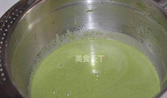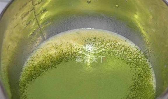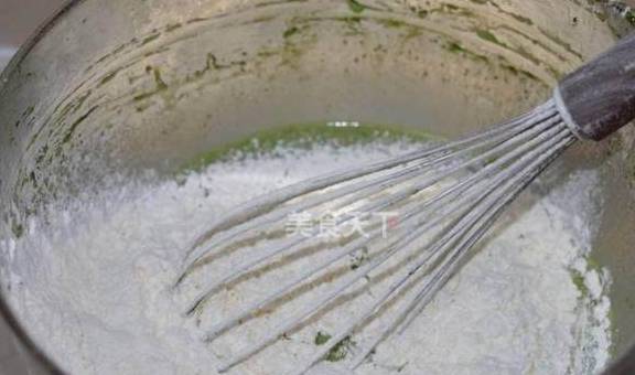 4.筛入抹茶粉,这一步抹茶粉也许会形成小颗粒,不以融化,没关系,后面多过筛几步。或者可以先用少许牛奶与抹茶粉搅拌融合后再倒入蛋糊中。