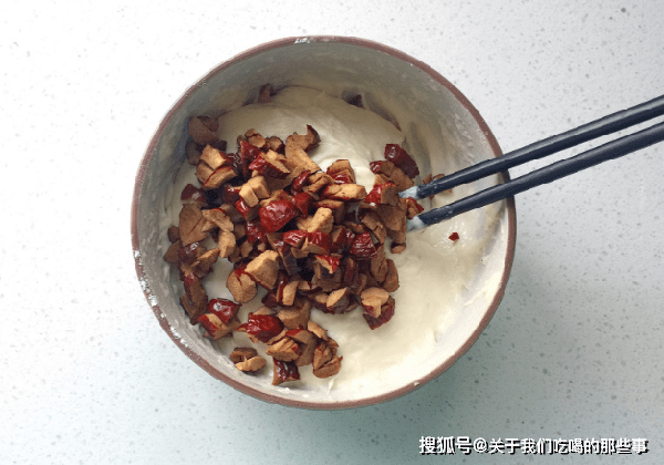 2、用筷子把牛奶、面粉、红枣碎搅拌均匀,搅拌成非常粘稠的状态,牛奶和面粉的比例是1:1,这样粘稠度刚好。容器里刷上一层油,倒入搅拌好的面糊,包上保鲜膜,放在温暖的地方发酵1小时,变成两倍大即可。