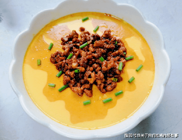 3、蒸熟的鸡蛋羹取出,倒入炒好的肉末,撒上葱花,即可食用。