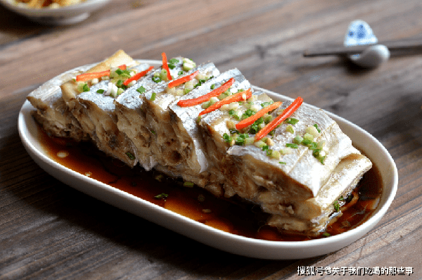 2、把姜片铺在碗底,腌好的带鱼段放在姜片上。蒸锅加水烧开,放入带鱼段,上锅蒸15分钟。香葱洗干净切末,红辣椒切丝,带鱼蒸熟后倒掉盘子里的汤汁,放上葱花、红椒丝,锅里烧一些热油泼在上面,淋入一些生抽,就可以吃了。