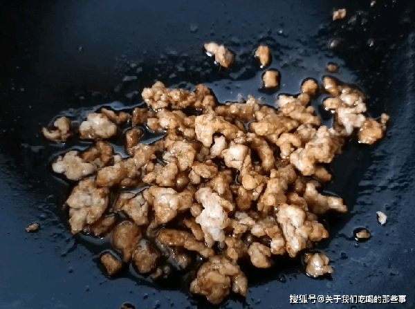 2、瘦肉洗干净剁成肉末,起锅烧油,放入肉末小火煸炒一会儿,炒干水分后淋入料酒去腥,加入生抽、蚝油调味,加适量清水煮5分钟,淋入水淀粉勾芡,汤汁浓郁后关火。