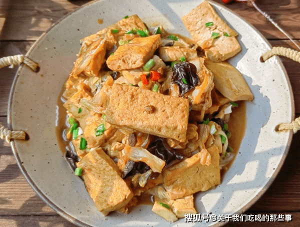 3、白菜炒软后放入煎好的豆腐块、木耳,倒入调好的料汁,翻炒均匀后小火炖3分钟,撒上小米椒,翻炒均匀后即可出锅。