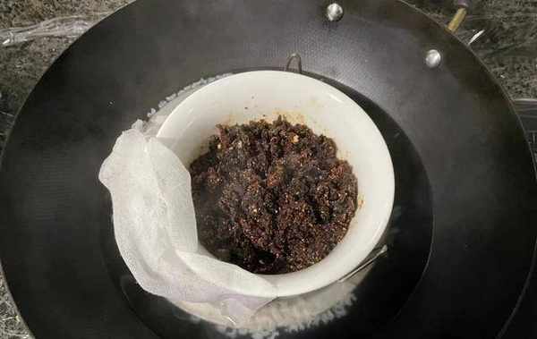 桂圆肉和西洋参的比例为10:1,如果怕苦,可以加一些白糖一起蒸,比例为10:1:1,西洋参和桂圆肉都要用破壁机或是绞肉机打成粉和果泥,搅拌均匀上锅蒸。我们如果有双层蒸笼,可以下面一层放一碗大米清水,上面一层放玉灵膏。每次蒸5小时,之后换一次大米,继续蒸,蒸足40个小时。