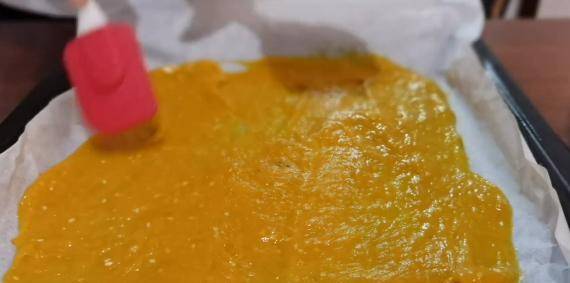 最后把酸枣泥和南瓜泥放到一起搅拌,加入适量的白砂糖和芝麻,搅拌均匀,最后放到油纸用铲子或是勺子背均匀摊开。