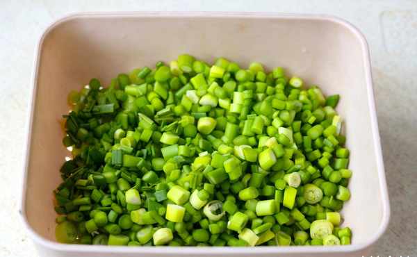 第二步:将鲜嫩的蒜苔用刀剁碎。这一步的目的主要是为了更容易烹调和入味。