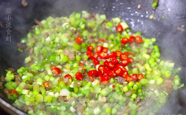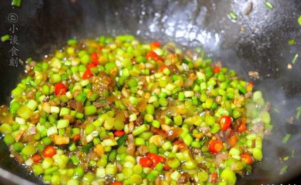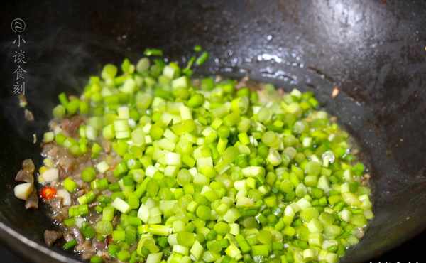 第四步:炒香后,加入蒜末和姜末爆香,然后加入辣椒小米,将切碎的蒜苔全部倒入锅中。