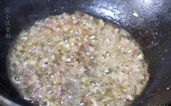 第三步:锅里放植物油,烧热,放入腊肉丁开始翻炒出香味,腊肉最好肥一点。
