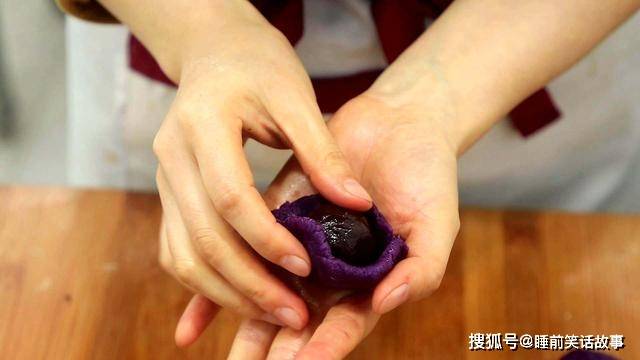 包住豆沙馅,慢慢把饼皮往上推。收口处揉圆,包好,收口朝下放在一边。