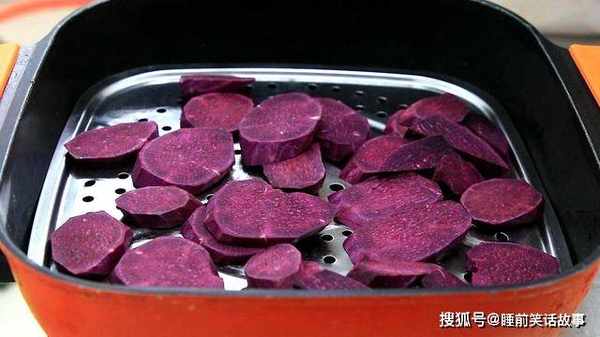 10分钟以后,我们掀开锅盖,取出紫薯倒在盆中。加入白糖10克,