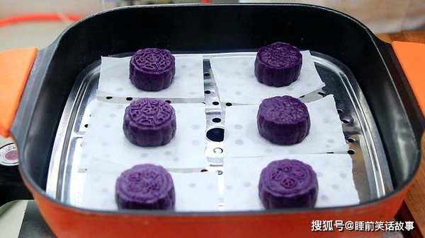 把月饼坯,放在锅内的纸张上面,中火蒸10分钟。关火,停上2分钟再取出月饼。等月饼凉了以后放在冰箱冷藏室放上几个小时。