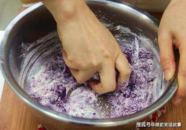把面粉、紫薯泥和成面团。用手分成6个小剂子搓揉成圆球,然后拿起一个紫薯面团,用手按扁。