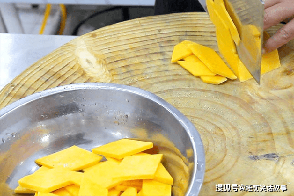 新鲜的百合100克,切去根部。用手掰开,加入清水,泡在盆中。南瓜400克,削去外皮,切成菱形片,放在盆里。