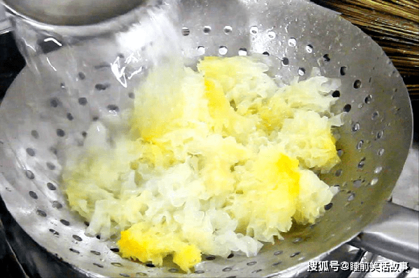 锅内烧水,烧开后倒入泡好的银耳。焯水30秒捞出,然后用清水反复冲洗,以使其脆嫩,口感鲜美。