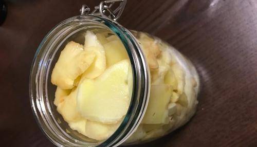 2.腌制好的姜片放入罐子里(如果出水太多倒出来一部分),倒入没过姜的醋,醋要选择颜色浅一些的品种。