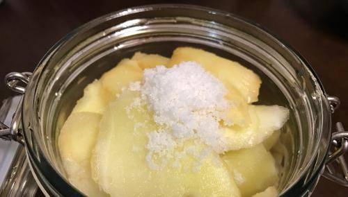 1.选用嫩一点的姜切薄片,撒上适量的盐腌制一晚。
