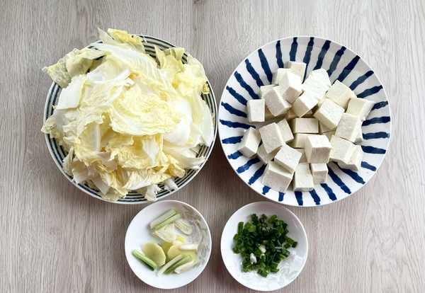 大白菜1/2棵,北豆腐1块、葱姜蒜适量,生抽1勺、清水1碗,盐1小勺,食用油2勺,葱花适量