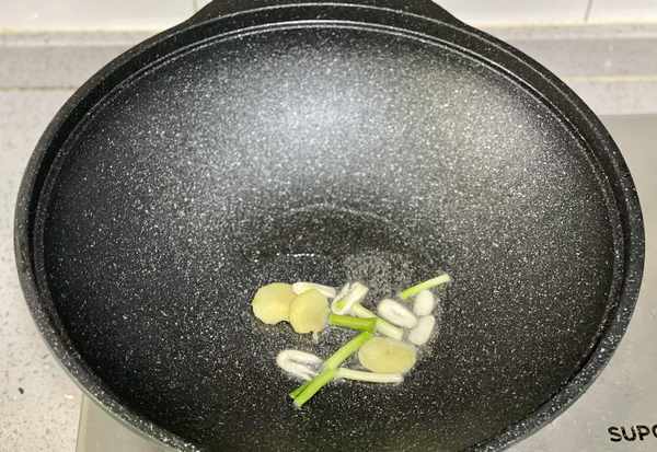 2、锅里热油,下葱姜蒜爆香;