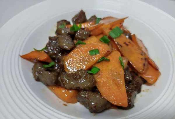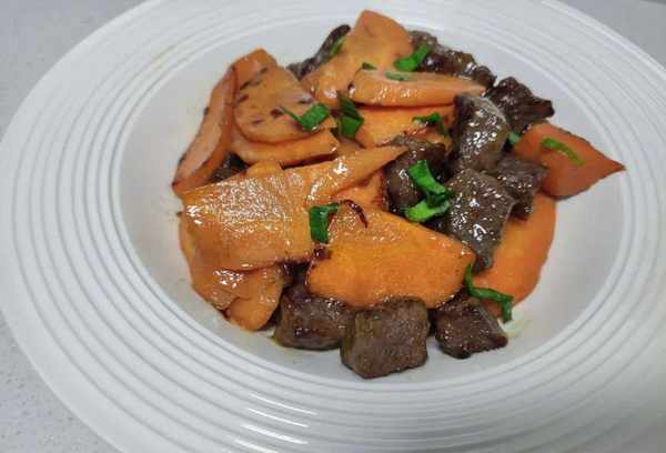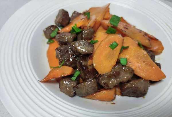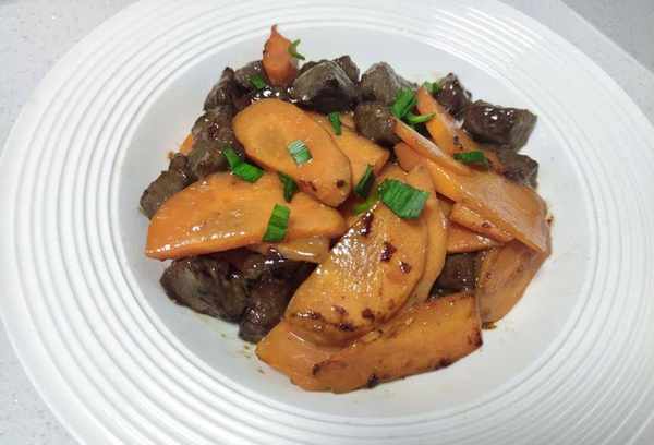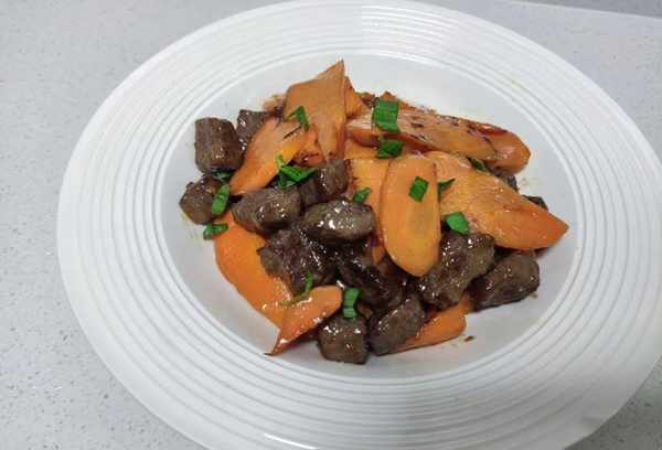 很快,一份牛肉块和胡萝卜就完美了。里面的牛肉块很新鲜,很有嚼劲。胡萝卜香甜可口,一起煮营养和风味更上一层楼。孩子不爱吃肉片,可以试试这个方法,很不错。