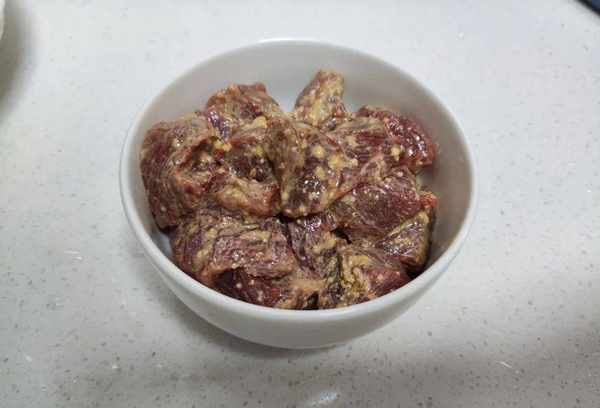 1.牛肉切前洗净。洗净后切成小方块腌制。腌制牛肉时,加入少许花生油,用手多搓几下,使腌制好的牛肉嫩滑入味;