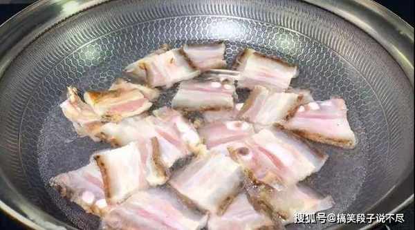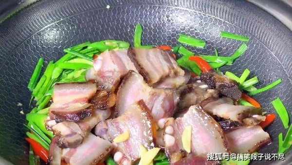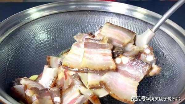 5、继续热锅,放少许油,倒入腊肉,炒出油水后捞起。