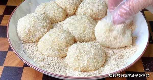 6、做好的团子,放在黄豆砂糖粉中,给它裹一层。