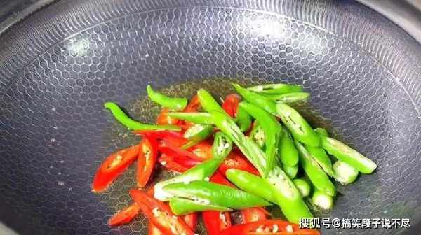 6、锅中剩下的油水,放青红辣椒,炒半分钟,加一勺食盐调味。