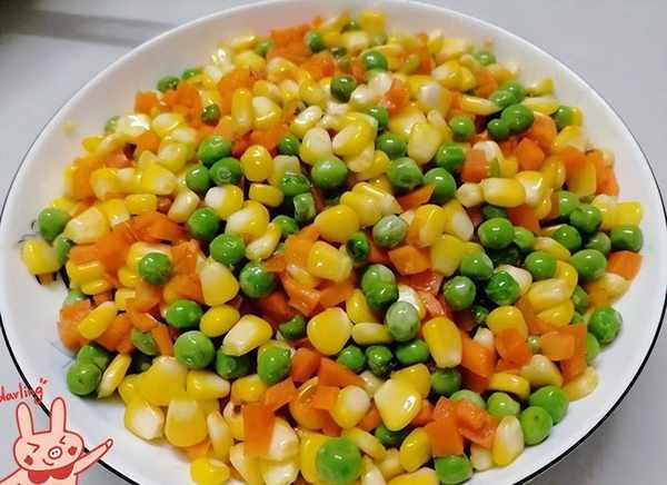 (4)热锅,加入豌豆、胡萝卜、玉米一起炒。