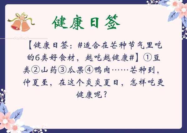 【健康日签:#适合在芒种节气里吃的6类好食材,越吃越健康#】①豆类②山药③瓜果④鸭肉……芒种到,仲夏至,在这个炎炎夏日,怎样吃更健康呢?↓↓↓