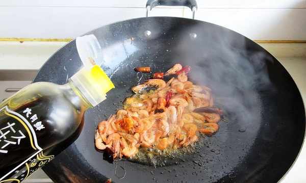 4、加入新鲜河虾翻炒均匀,出香味。多翻几下,将新鲜的小河虾炒至变红,散发出香味。