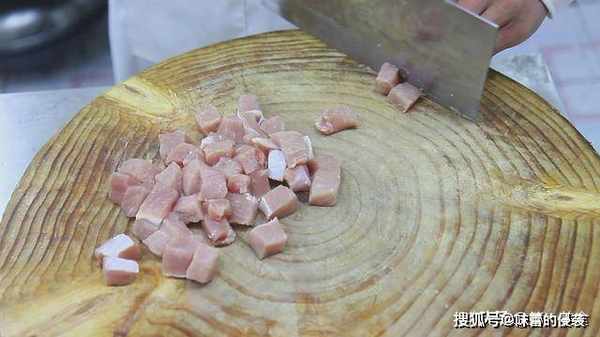 1.先准备一块里脊肉,用刀先切成厚片,接着切成大一点的肉丁。