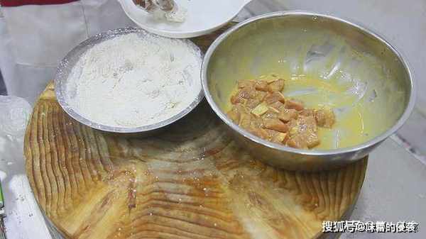 5.准备两把干面粉,把刚才拌面糊的肉丁,均匀的沾上干面粉。沾完之后,放置在旁边。
