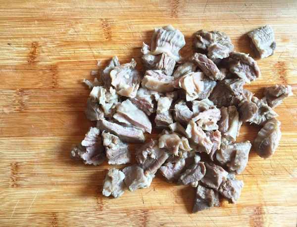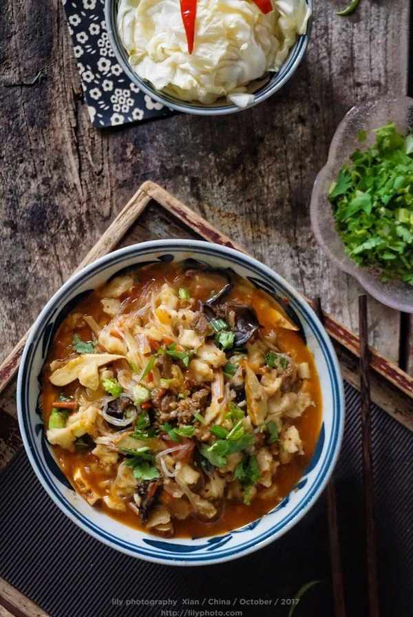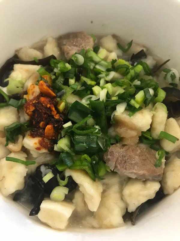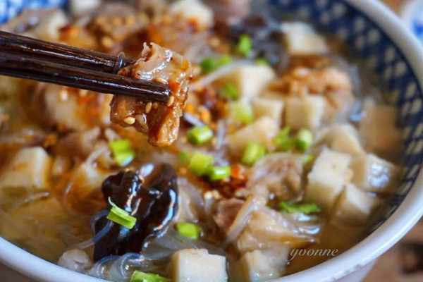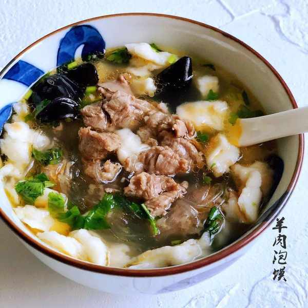 7. 鍋裏倒入羊湯半碗再加入半碗清水,下黑木耳、掰碎了的白吉饃和粉絲,大火燒開轉中火煮一分鐘,放入切好的羊肉塊,再次煮沸關火加鹽和白胡椒粉調味。盛出加入辣椒油和青蒜末。