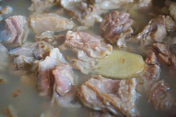 1. 提前燉好的一鍋羊肉湯。把羊腿肉切塊焯水後再次入清水鍋裏,加薑片、葱段、黃酒、桂皮、花椒、八角、小茴香、草果、香葉、幹橘皮等調味料,大火燒開轉小火慢燉2-3個小時,關火後加入適量的鹽調味。