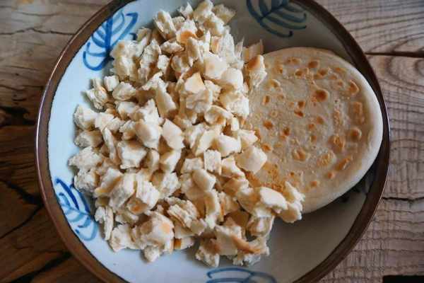 3. 加蚝油。把饃用手掰成小指尖大小的小塊,放碗裏備用。也可以用刀切成小塊。