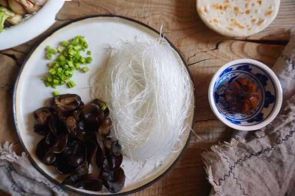 4. 粉絲提前泡水,軟後撈出瀝幹。黑木耳泡水後洗淨備用。糖蒜1頭。青蒜洗淨切碎末。