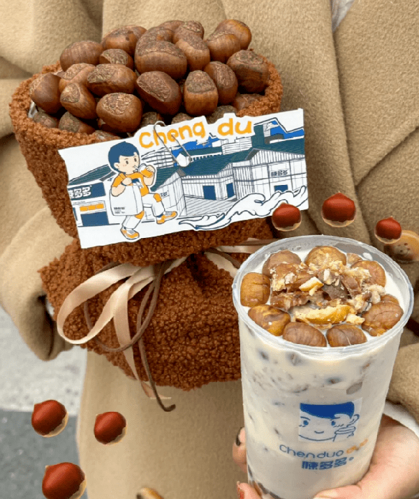此外,栗子还可在形式做创新,比如新茶饮陈多多品牌,去年推出栗子奶茶新品时,就将板栗以花束形式包裹打造出“栗子花”这个概念,非常有意思。
