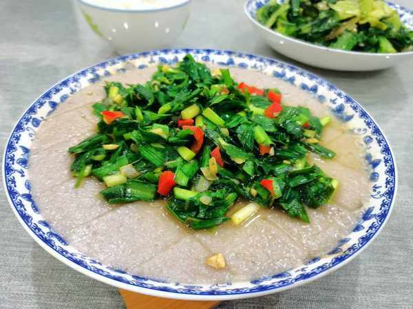 这是简易版的荞面搅团,做法很简单,把荞面糁子泡软,放豆浆机里面,加3倍的清水打成荞面糊糊,倒入盘子里面放凉,划成小块,放上炒香的韭菜花,就成了简易版的荞面搅团了。