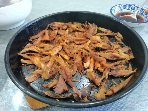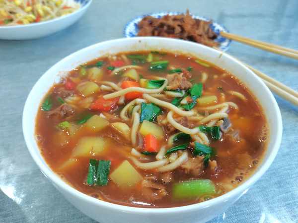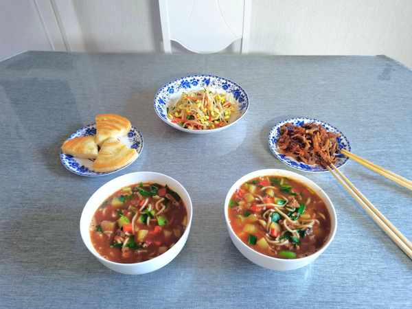 荞面臊子面,红萝卜拌豆芽,发面饼,烤鸡肉丝。