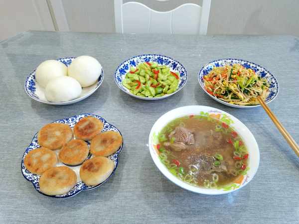 发面烙饼,香豆子花卷,大米小米稀饭,辣油冬瓜,牛肉炒藕片。