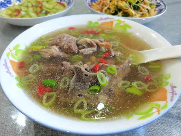 清炖羊肉,糯米枣泥馅饼,热馒头,蒜泥黄瓜,拌三丝。