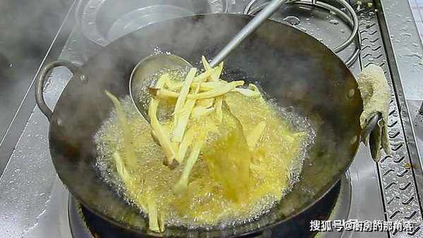 锅内烧油,油烧至五成热(微微冒烟),倒入撕成条的杏鲍菇,炸至变软后,捞出控油。