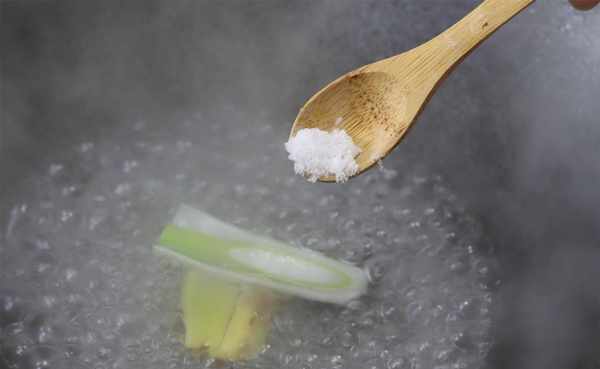 2.在铁锅中加入几汤匙水。这不是用来煮虾的,而是用来做调料的。放入几片姜和大葱,加少量盐,煮1分钟让锅里的少量水融入香料。闻。