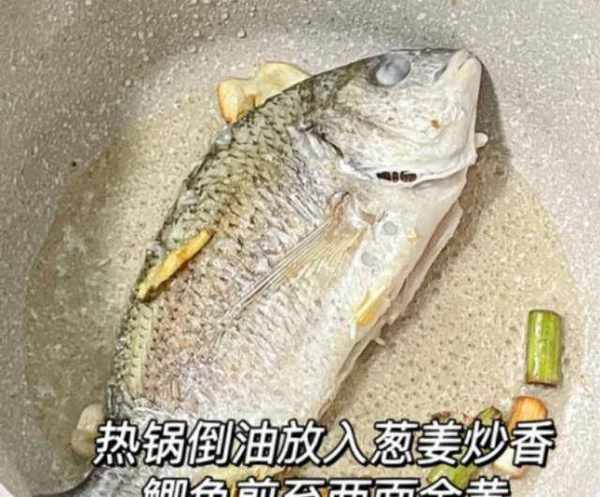 第四步:锅底调入少许食用油,锅底撒上一些食盐,将海鲫鱼放在锅中,中小火将其煎至金黄,加上一些葱段和姜丝炒香,加上半勺料酒去腥。