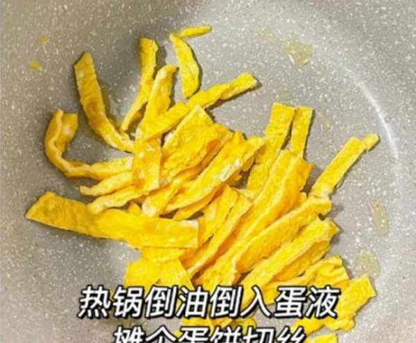 第六步:另外起锅加上少许油,将蛋液铺平在锅底,记得要薄薄地铺一层,煎熟后切成细丝。