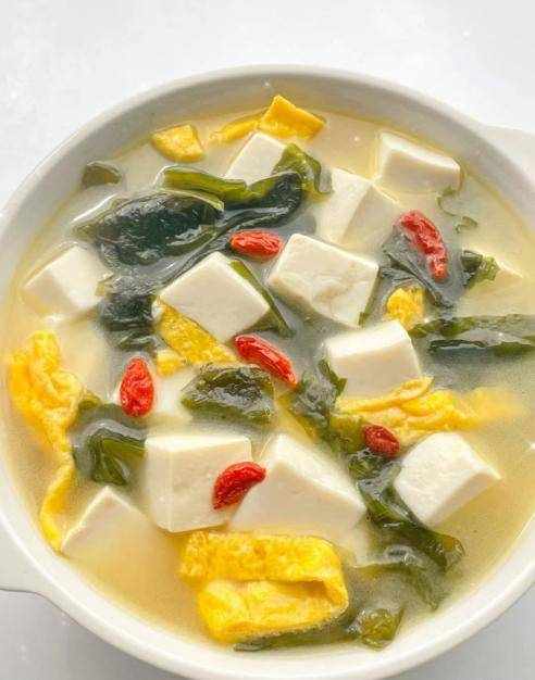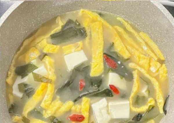 第八步:大火继续煮10分钟,最后丢入一些枸杞子,加上食盐和白胡椒粉少许,继续煮一分钟,关火出锅,这道裙带菜海鲫鱼豆腐汤就制作完成了。