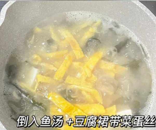 第七步:锅中加上半勺猪油,加上葱花和姜丝,加上过滤好的鱼汤,放入一些鸡蛋丝,依次放入裙带菜和豆腐块,盖上锅盖焖煮一会儿。