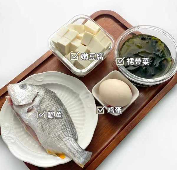 挑选一些食材:选购一条新鲜的海鲫鱼(海鲫鱼生活在海洋里的鱼类,价格贵一些,营养价值很出色,也可以用来煮汤喝),嫩豆腐一大块(嫩豆腐是优质的豆制品之一,其中钙质含量最高,可以用来煮豆腐汤,营养更好消化和吸收),裙带菜30克左右,鸡蛋一个,适量冷水,少许食用油,几根小葱,若干片生姜,料酒少许,枸杞子一小把,少许食盐,胡椒粉一丢丢,其他调味品。
