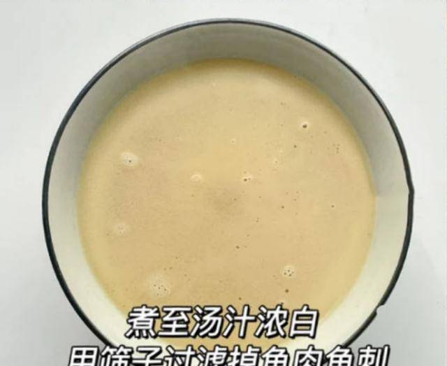 第五步:用锅铲将鲫鱼压碎,倒入适量开水,将汤汁再次煮沸,等待汤汁至奶白色,用筛子将鱼渣过滤掉,过滤后的鱼汤都是营养价值,汤汁也特别鲜美。