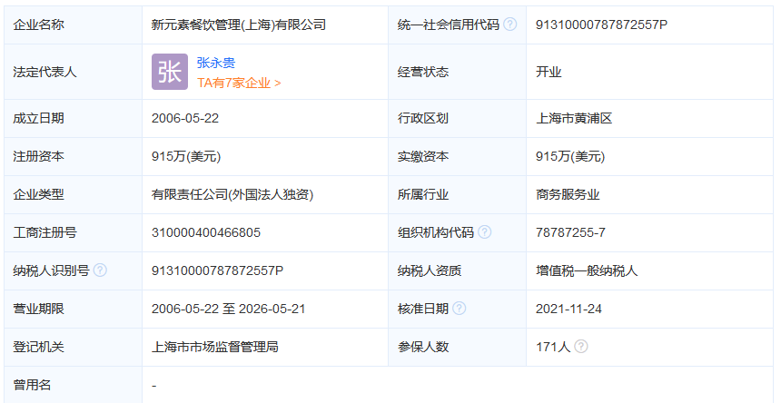 此外,天眼查信息显示,2022年8月8日,新元素餐饮管理(上海)有限公司被上海市黄浦区网民法院强制执行,执行金额为13324元